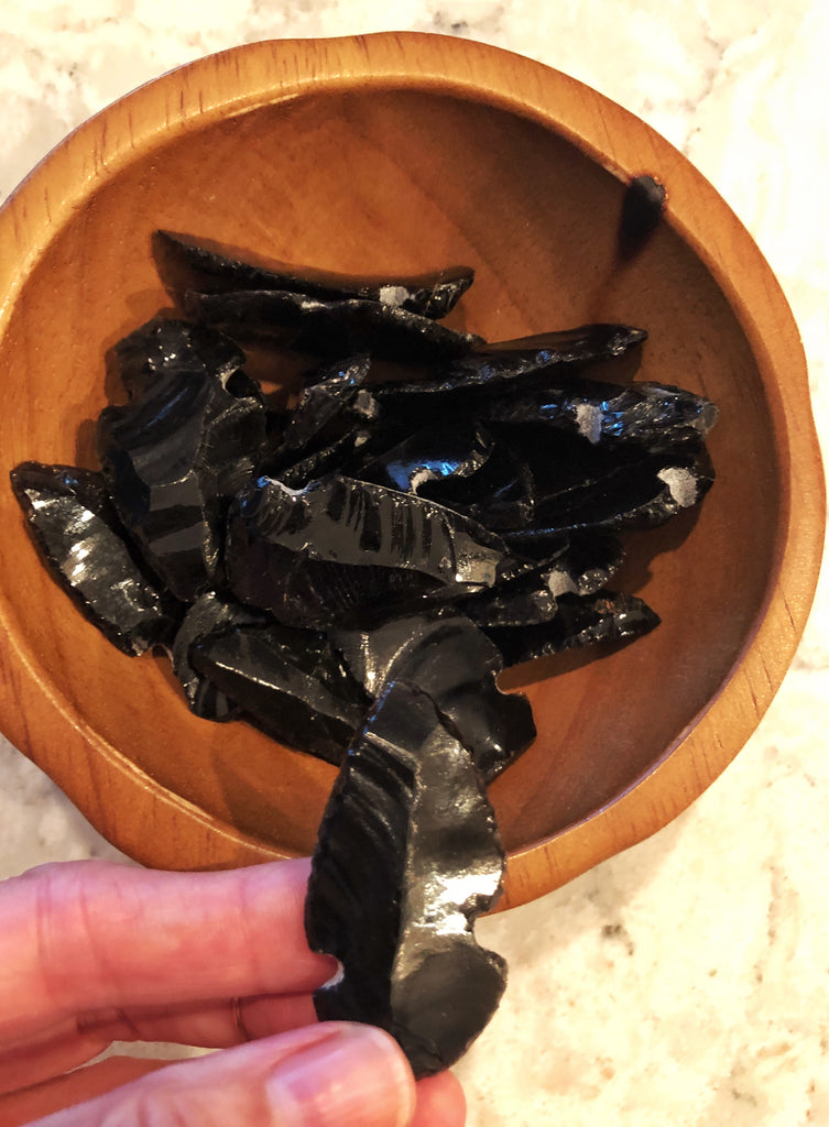 Black obsidian aids in healing issues aligned with the unhealed shadow self. It powerfully eliminates negative energies in oneself and the outer environment along with clearing the auric field of all kinds of "astral" junk and negative attachments. Connected with the root chakra it is a great stone to use for grounding the body and it is a deep spiritual protector. This arrowhead is used for helping to bring out one's shadow material out of exile and allows it to be transmuted through the heart.